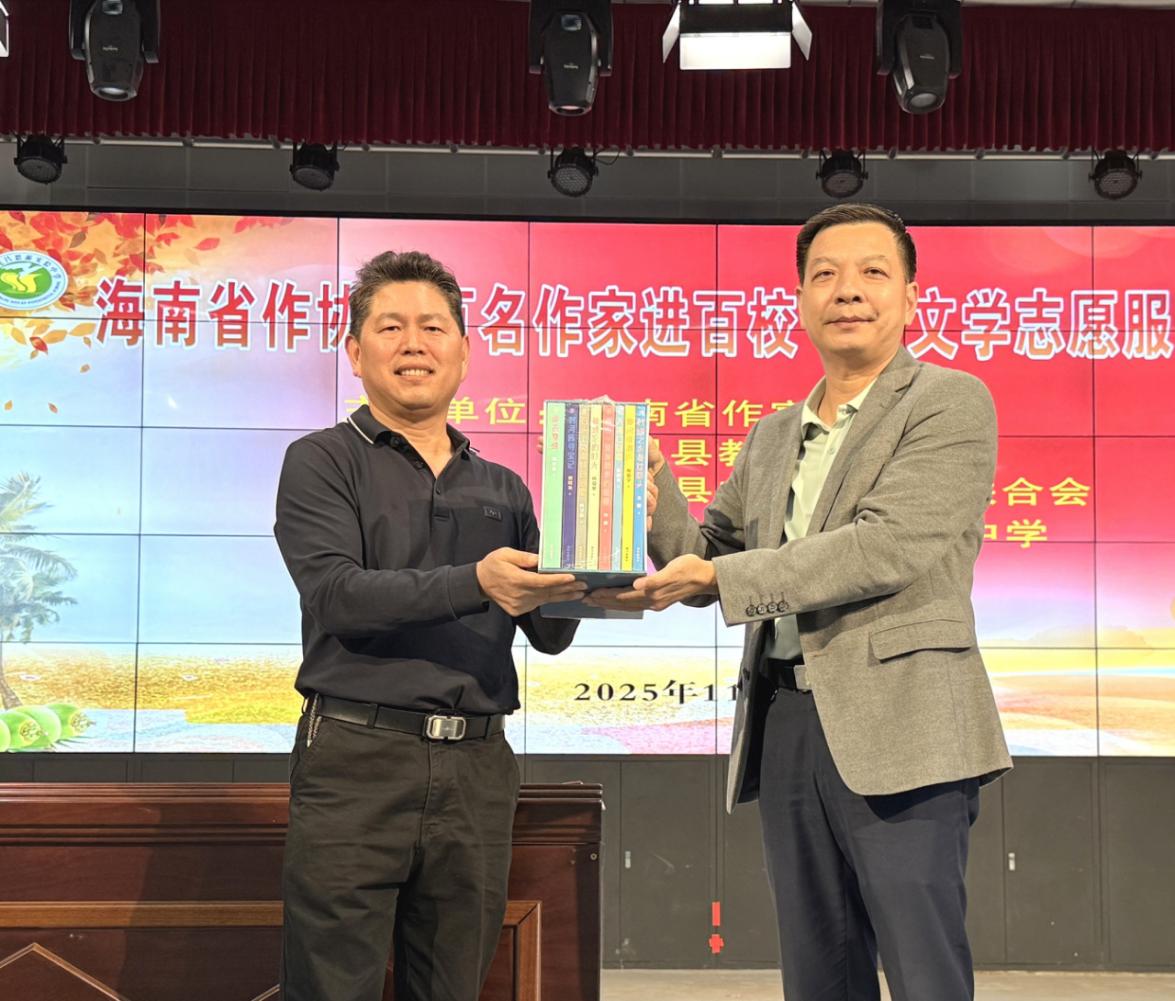 讲座开始前,彭彤代表海南省作协向屯昌思源实验中学捐赠了近年来组织推出的两套文学丛书。该校校长陈日国表示,校园活动的作家们为师生搭建了一个亲近文学、对话经典的重要平台。鼓励学生多读书、读好书,发展和发展文学培养的人才。