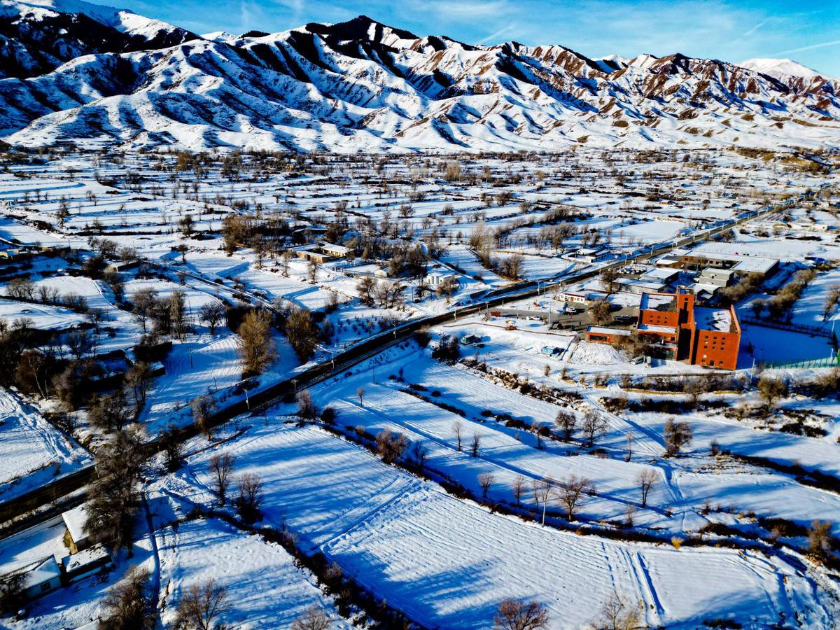 11月27日,冬季的吉木萨尔县新地镇与远处白雪皑皑的群山相得益彰。