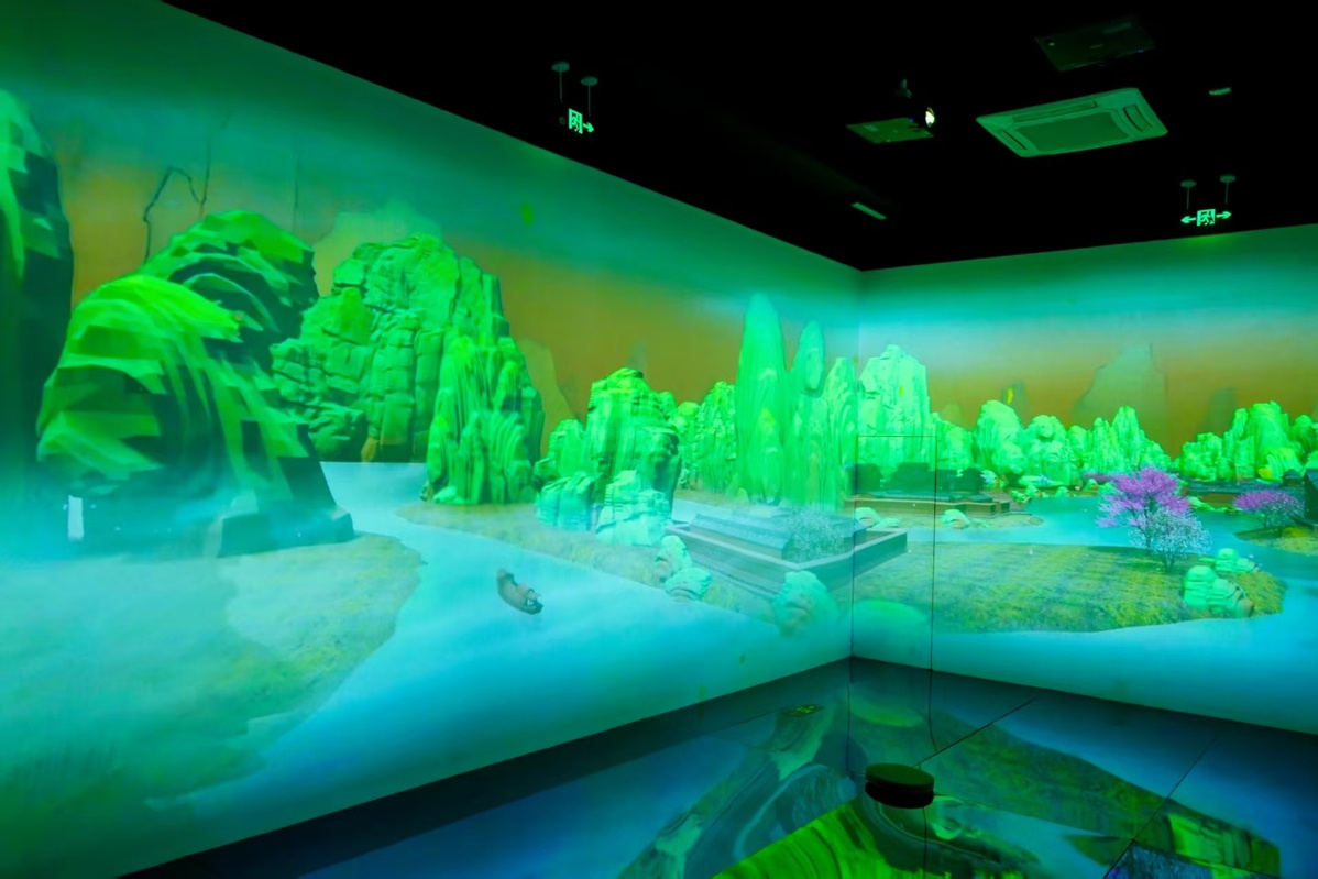 盛唐之风穿越千年,停在西安博物院二楼展厅。 “优雅的《长安——王维文化艺术数字化沉浸展》以科技为笔,重生了当代诗书画大师的山水意境。屏幕上出现了科技修复的“忘川画卷”:春天桃花轻落涟漪,秋天枫叶红遍山林,精准歌颂了“白石出景西,红叶稀少”的诗句。观众行走于此,感觉仿佛行走在忘川河畔,气息中弥漫着大唐的美景。