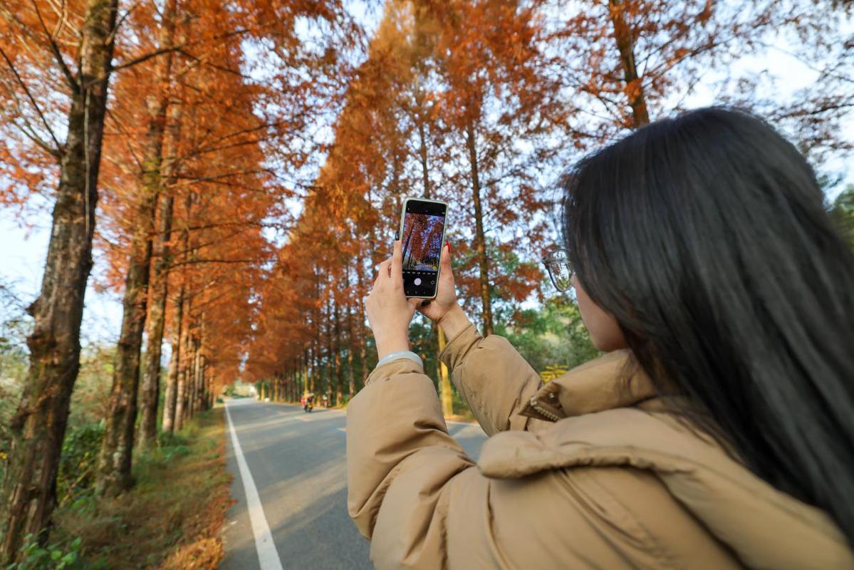 12月3日,游客在武夷山国家公园251环路网红路打卡点拍摄水杉林景观。 (邱汝泉 摄)